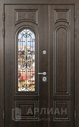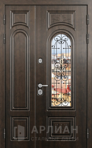 Металлическая двустворчатая дверь со стеклом и кованой решеткой №15